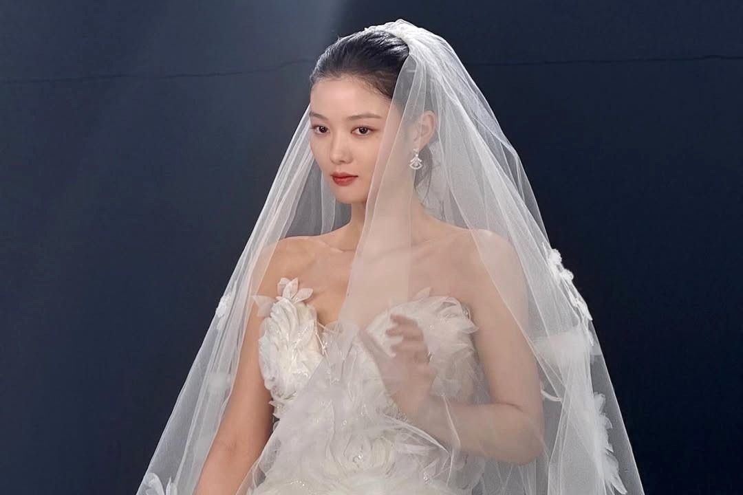 Kim Yoo Jung tampil dalam beberapa gaya gaun pengantin, mulai dari klasik putih dengan veil hingga gaun hitam off-shoulder yang elegan.