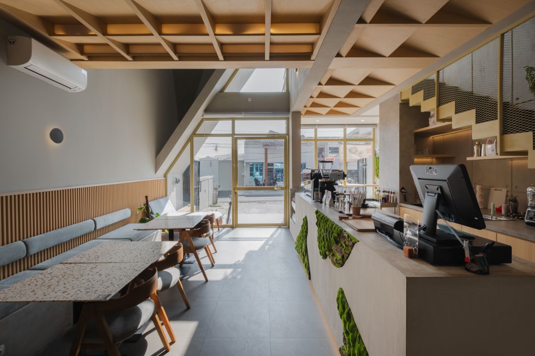 Kafe ini dirancang dengan pendekatan konseptual yang kuat bernama “Geometry of Warmth“, sebuah perpaduan cerdas antara bentuk geometris tegas dan nuansa bersahabat yang mengundang.