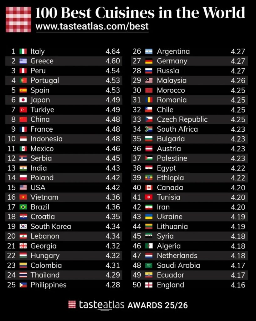 SHOWBIZLINE – Situs ensiklopedia kuliner global TasteAtlas kembali merilis daftar 10 negara dengan kuliner terbaik di dunia untuk tahun 2025.